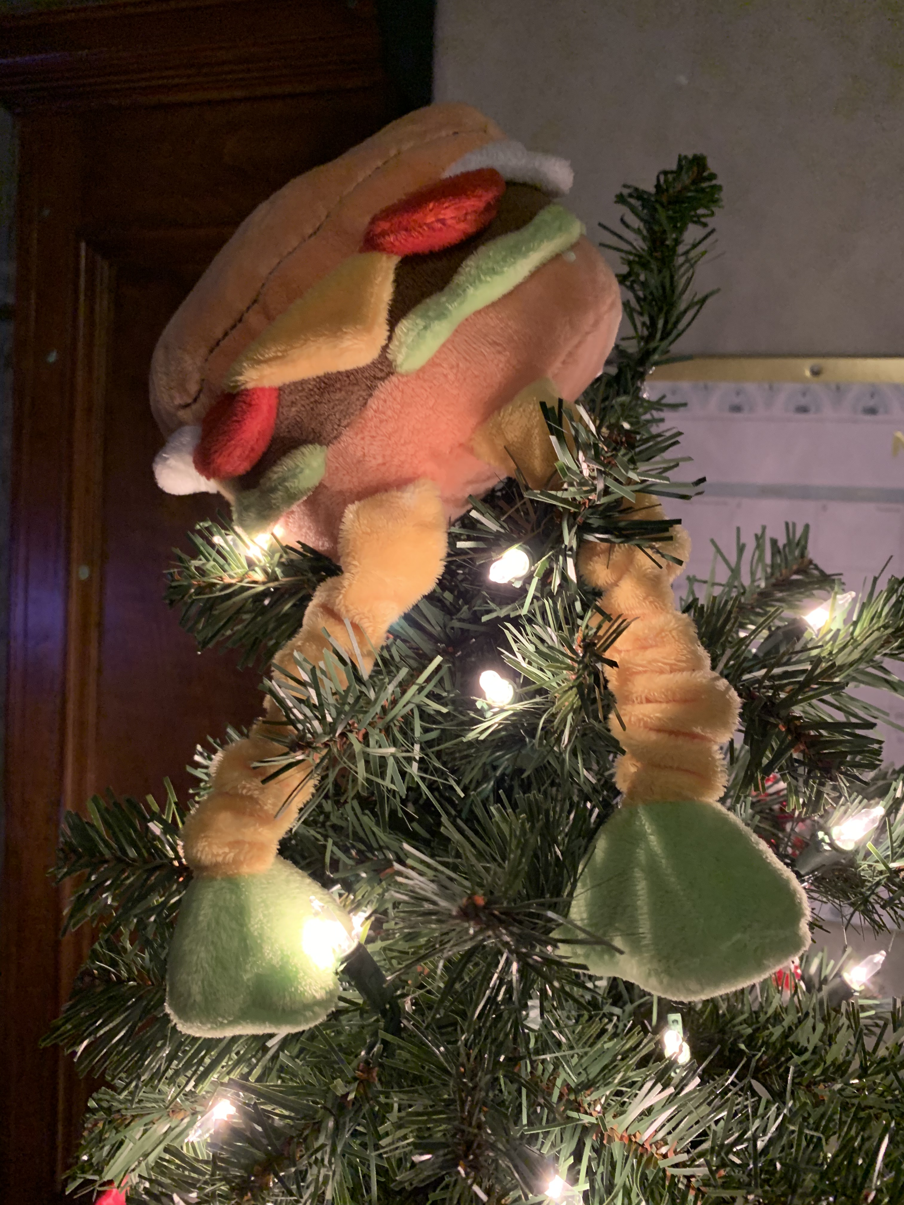 While tradition is key during this time of year and one might expect to see a star or an angel at the top of the tree, we consistently and unabashedly put this cheeseburger with legs on top. I can’t tell you why or when it started, only that it is strange and glorious and weirdly normal at this point. It makes me smile every time I see it, and especially every time someone comes over and takes brief moment to pause and ask, tentatively, “is that–is that a cheeseburger?“