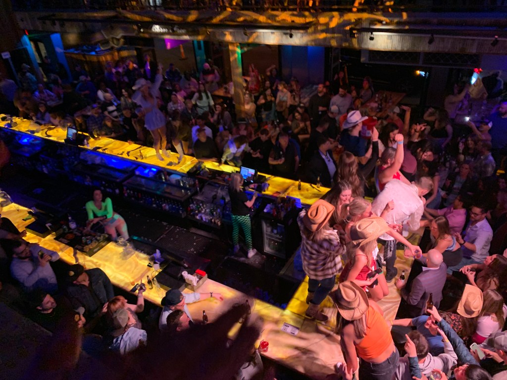 When we finally did walk downstairs, we only got as far as the second floor (there are five total). Because on the second floor, you can look out over the first floor, which had people dancing on top of the bar, a live band singing while a bartender poured a beer on someone, and people cheering, singing and raising their glasses all over the room.