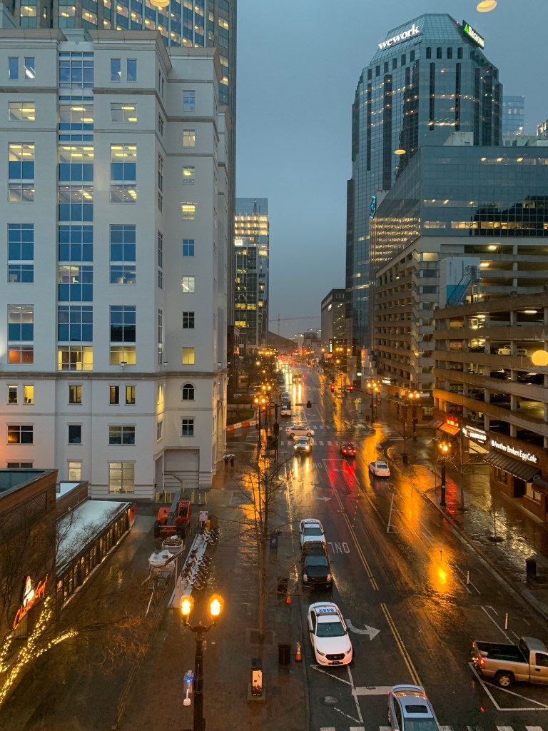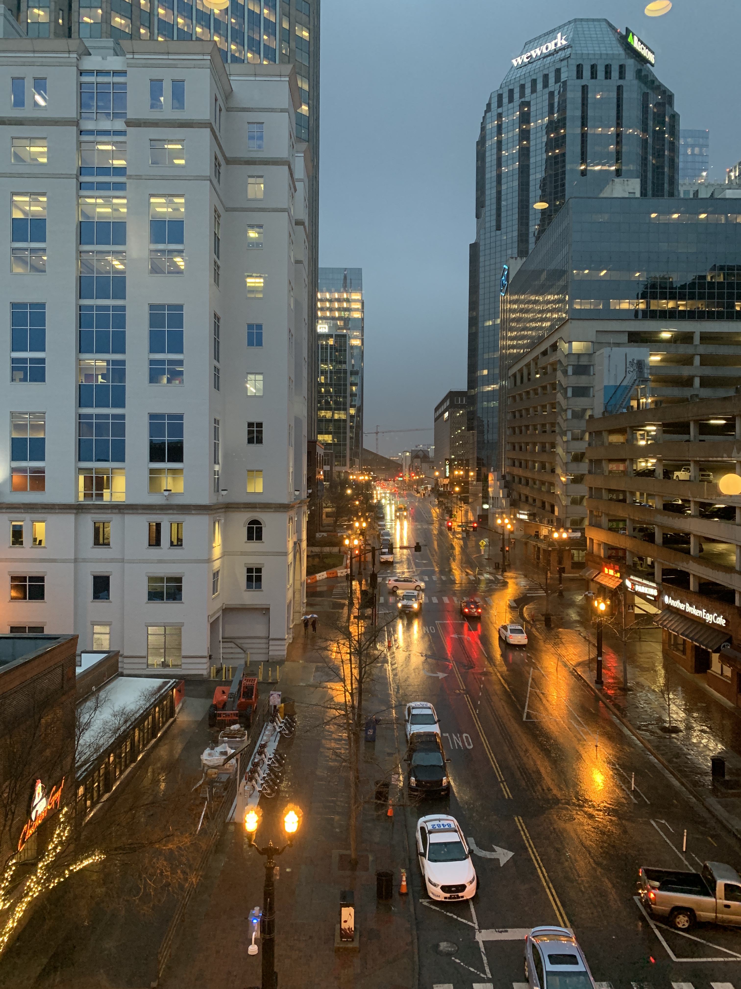 By the time we got home that evening, our group was entirely too exhausted to even consider going out again. We’d been running on an average of 4-5 hours of sleep, and were set to fly home the next day. So, we robed up—embracing our last night as *penthouse people*—and ordered in some pizza. A rainstorm blew in and drenched the city, sending many people on the streets below running for cover. Wind whistled through the buildings and cars moved slow. We all went to bed early that night, and our bodies thanked us for it.