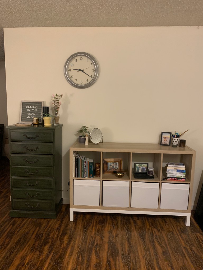 If you’re wondering if I have an eye for interior design, when shopping to decorate my apartment, I typed, “a bookshelf” into Google. I had no idea what I wanted or what key words to use, I just knew that I wanted a shelf to go right *points to corner of room* there! Eventually, I came across this bookshelf and I’m so happy I did! It was easy to put together and the final product was exactly what I was looking for. I also love how cute it looks next to my green thrifed dresser! 🙂 (find it here.)