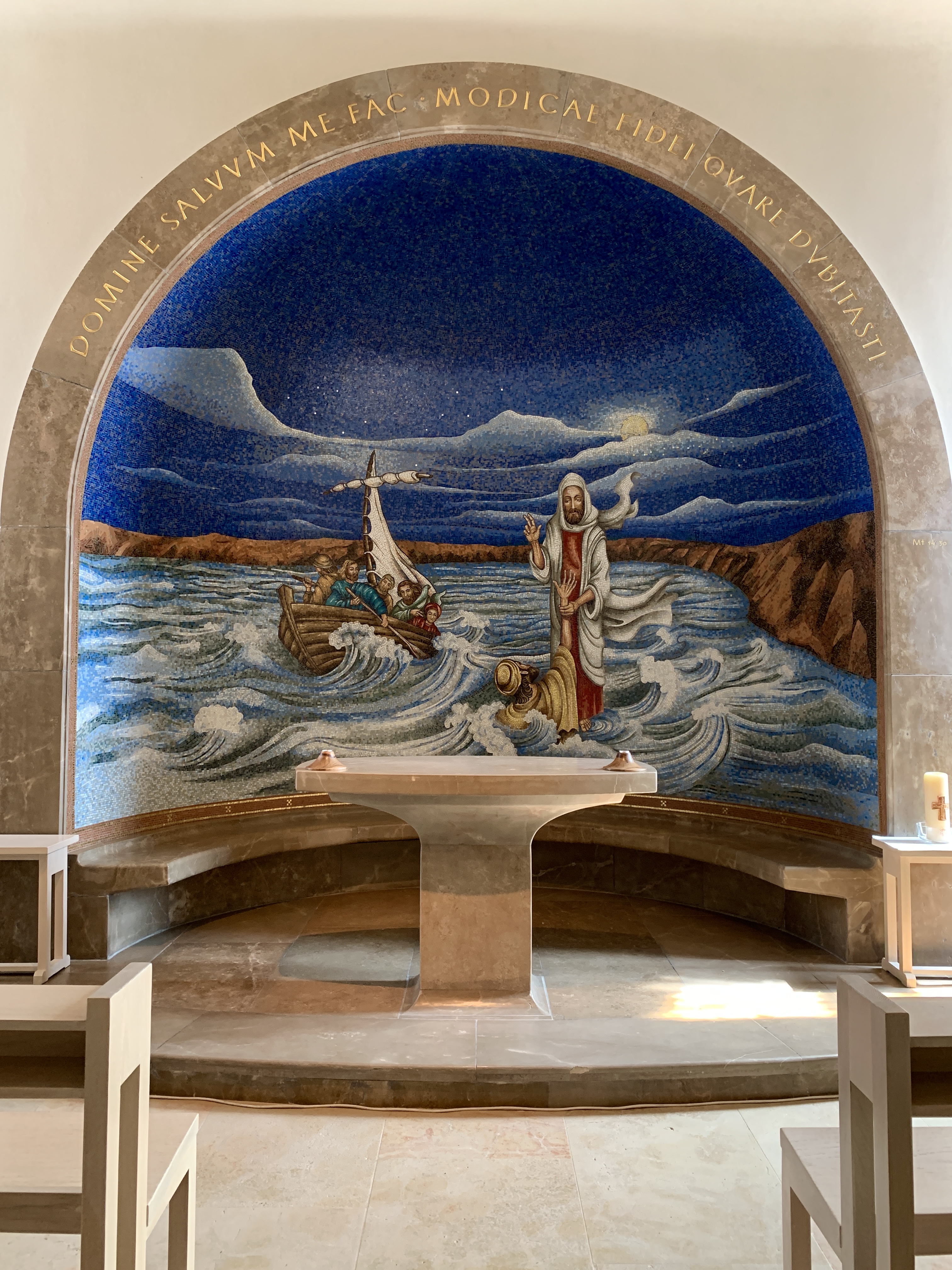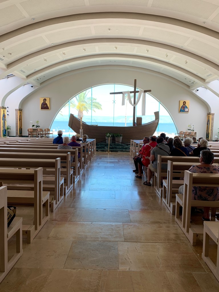 In the main chapel, a boat sits in front of a glass window, with the Sea of Galilee in the background. It is designed so that, when sitting in one of the pews, the boat looks as if it is sitting on the Sea of Galilee.