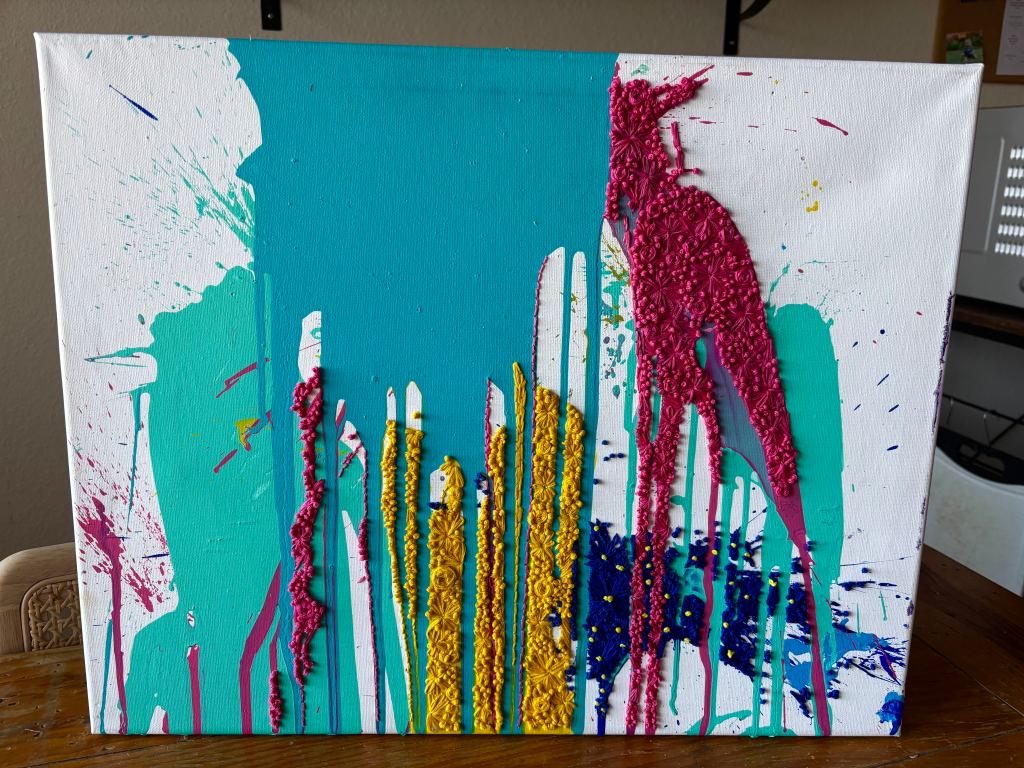 For my 27th birthday, my friends and I created a series of paintings using the Princess Diaries style balloon dart method. I kept a handful of the paintings, and when I moved into my apartment I was unsure how/if I could display them. I’d had them on my walls for years and if I’m honest, I wanted to refresh them, as they’d grown kind of stale to me. I didn’t want to throw them away, I just wanted to look at them in a new way, so I decided that I would try to embroider on top of them. I had never done embroidery before, as I’m a counted cross stitcher by trade, but I thought, why not? I watched a handful of YouTube tutorials that led my Instagram algorithm entirely into the embroidery space, and then I took a pencil to the painting, drew an outline for stitches, and just went for it. I’m not finished yet, but I’m loving how it’s turning out!