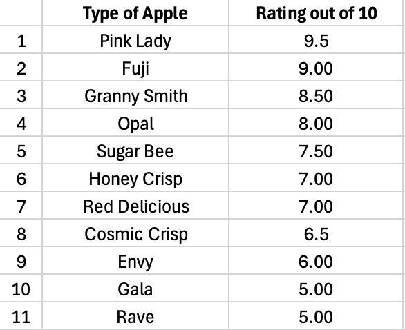 Check! The hilarious part of this one is that I tried eleven different kinds of apples, all for me to determine that my original favorite stands. Granted, there are still tons of varieties of apples out there for me to try, so I’m going to keep my spreadsheet open and active to track whenever I come into contact with one, but for now, Pink Ladies reign supreme.